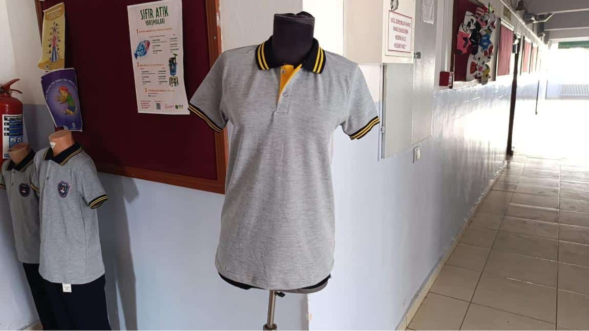 1-TİŞÖRT : Kumaş lakost kumaş olacak. Renk olarak gri, yaka rengi lacivert, yaka uçlarında çift çizgi sarı, düğme pat rengi sarı olacak. Okulun arması üzerinde olacak.